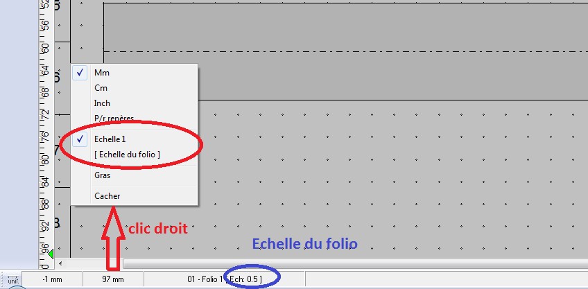 Les graduations des règles sont affichées soit à l'échelle 1 ( = la feuille ) soit à l'échelle du folio ( = l'armoire en vraie ).