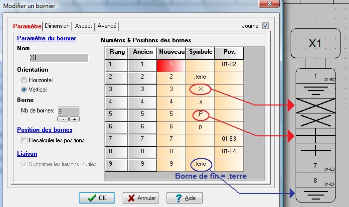Important: Cette onglet permet de modifier le bornier ET éventuellement les symboles bornes correspondants