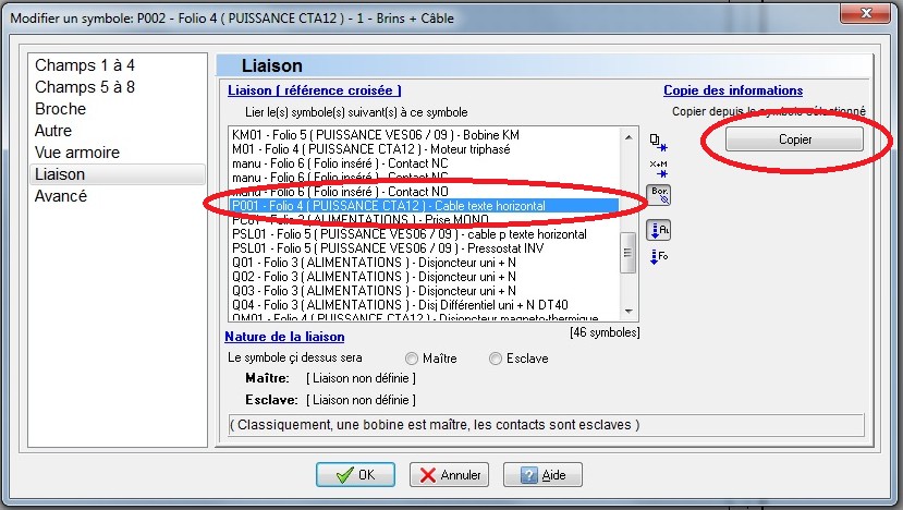 Dialogne Modifier un symbole / Onglet Liaisons / Copier les informations depuis...