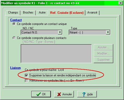Commande Modifier un objet, cliquer sur un symbole esclave, et dialogue Modifier un objet Onglet Ref. croisée ( esclave ) Case Supprimer la liaison.