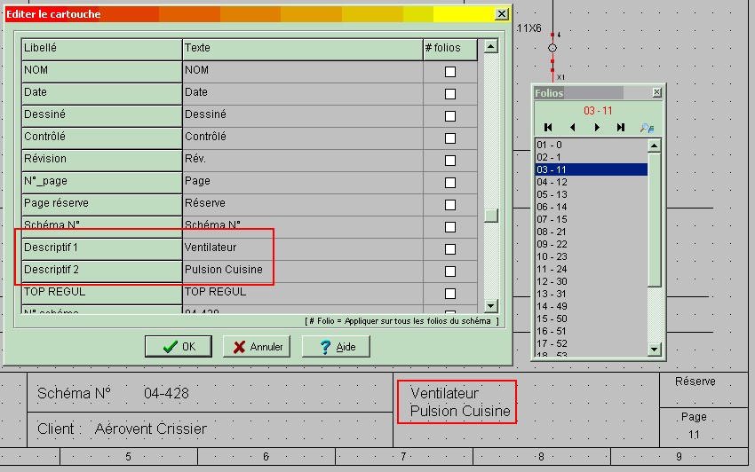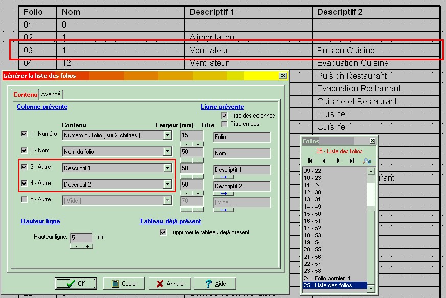 Lorsque la liste des folios est générée, on retrouve bien ( Pour le folio 03 ) " Ventilateur " dans la colonne " Descriptif 1 ", et " Pulsion