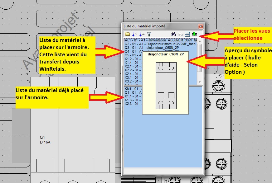 Cette palette affiche la liste du matériel importé ( C'est à dire les symbole " vue armoire " à placer sur l'armoire ).