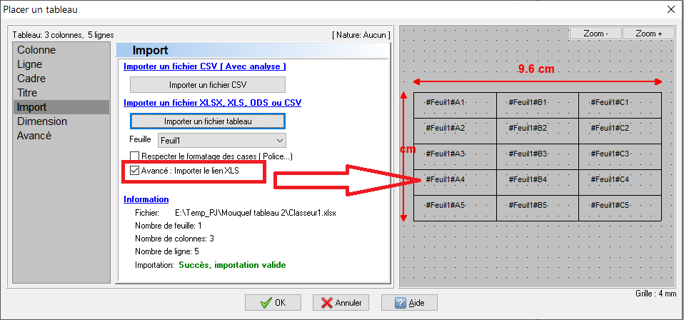 Dialogue Placer un tableau / Onglet Import : Avancé : Importer le lien XLS