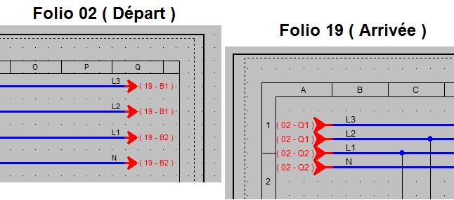 Permet de placer automatiquement plusieurs renvois de folio, à partir du 1er placé. Il suffit de placer le 1er renvoi de folio sur le conducteur du haut, les autres sont automatiquement placés sous les conducteurs situés dessous ( = Même coordonnée X ). Idem pour le folio arrivée.