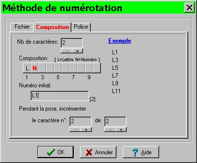 Avec les boutons Composition, sélectionner comme premier caractère L (comme Lettre) et N (comme Numéro), ce qui indique que le repérage sera fait : Lettre-Numéro.