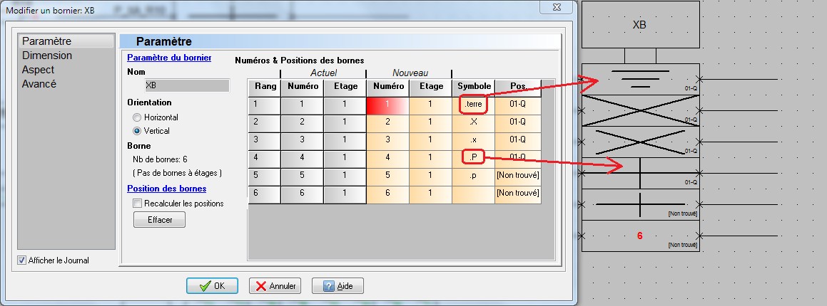 Important: Il est possible de modifier un bornier existant. Dans ce cas, le lien entre les bornes présentes sur le schéma et le bornier disparaît. Il ne faut modifier un bornier qu' en toutes connaissances de cause. L'utilisateur a ainsi une maîtrise totale des borniers. Seule l'utilisation de l'onglet Avancé modifie le bornier et les symboles bornes correspondants.