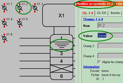 Astuce: Il est possible d'obtenir automatiquement, lors de la génération automatique, une borne ayant un dessin " Terre ", il suffit d'utiliser la valeur de la borne, avec un des mots réservés suivants: .terre, .X, .x, .P, .p. Attention, il y a un point devant le mot réservé. Voir l'exemple illustré plus bas.