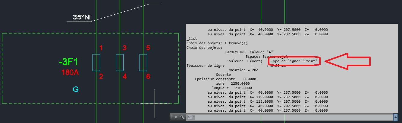 Exemple : Le cadre pointillé vert à un style de ligne nommé POINT ( logiciel utilisé : DWG trueView, Autodesk(tm) )