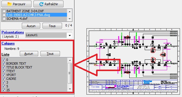 Gestion des calques : Les fichiers DXF/DWG à convertir sont normalement identiques au niveau des calques : Le choix réalisé dans la liste des calques s'applique donc à chaque fichier ( et donc à chaque folio / 1 fichier DXF/DWG = 1 folio )