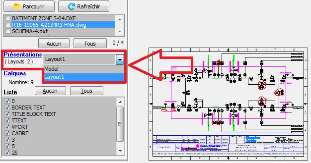 Présentations ( Layouts ) : Uniquement visible si le fichier DXF / DWG a plusieurs layouts. Dans ce cas, il faut sélectionner la layout à afficher. Lors de la conversion au schéma XRS: Chaque layout = 1 folio.
