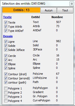 Permet de sélectionner les entités ( objets de base composants les fichiers DXF/DWG ) à intégrer lors de l'importation.